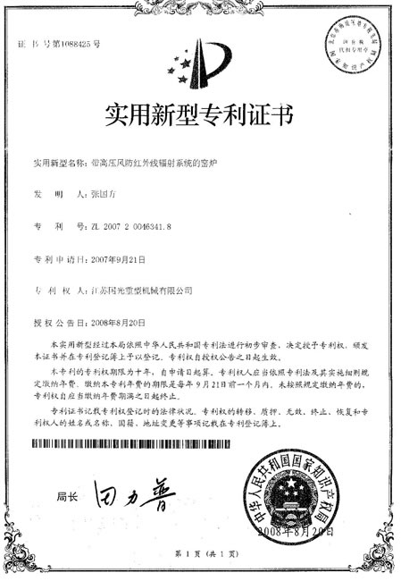 Utility model patent certificate: High-pressure air furnace with anti-infrared radiation system