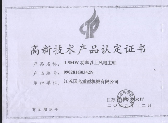 In 2009, our 1.5MW wind turbine rotor shaft was awarded the "High-Tech Product Certificate" issued by the Science and Technology Department of Jiangsu Province.